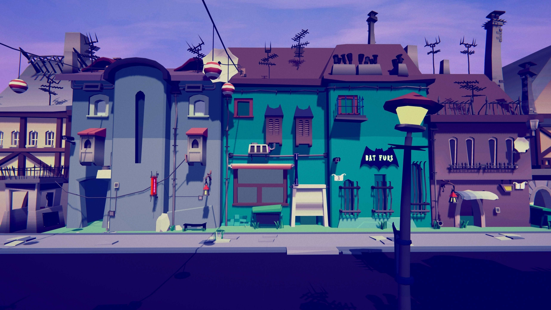 You get a set of tilted buildings, signs, cables, street props and a full demo BIIIIG scene with lighting and camera setup. Everything shares one clear, readable style that works from a distance and holds up during camera movement.What’s included