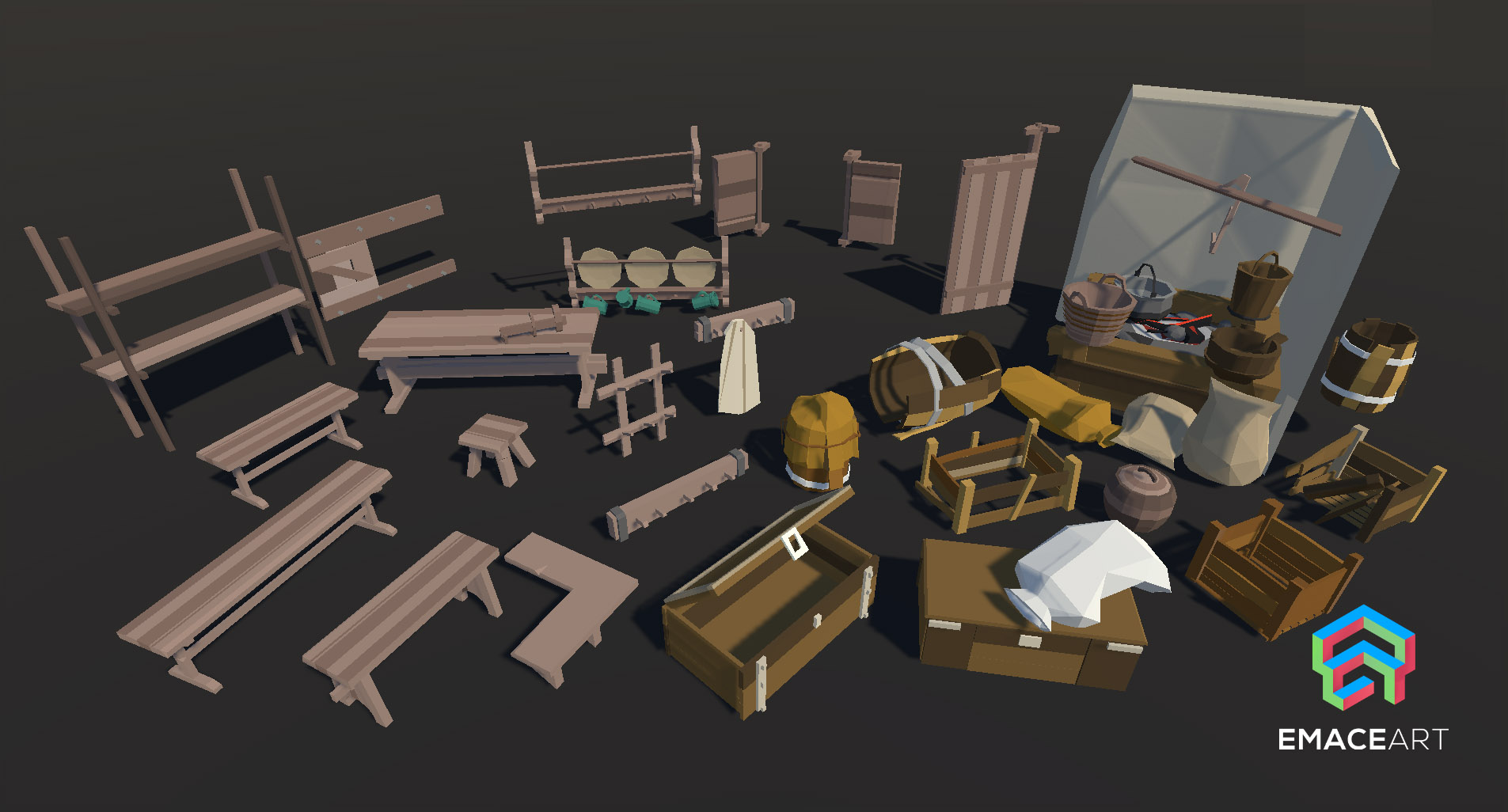 - Exterior: 22x Pier elements, 19x Containers (Barrels, Chests, Baskets), 18x Farm elements, 13x Forester elements, 7x Road signs/Shrines, 7x Benches, 6x Carts, 4x Wells, 2x Footbridges, 2x Ladders, 2x Troughs, 2x Tubs, 9x Brushwood.
