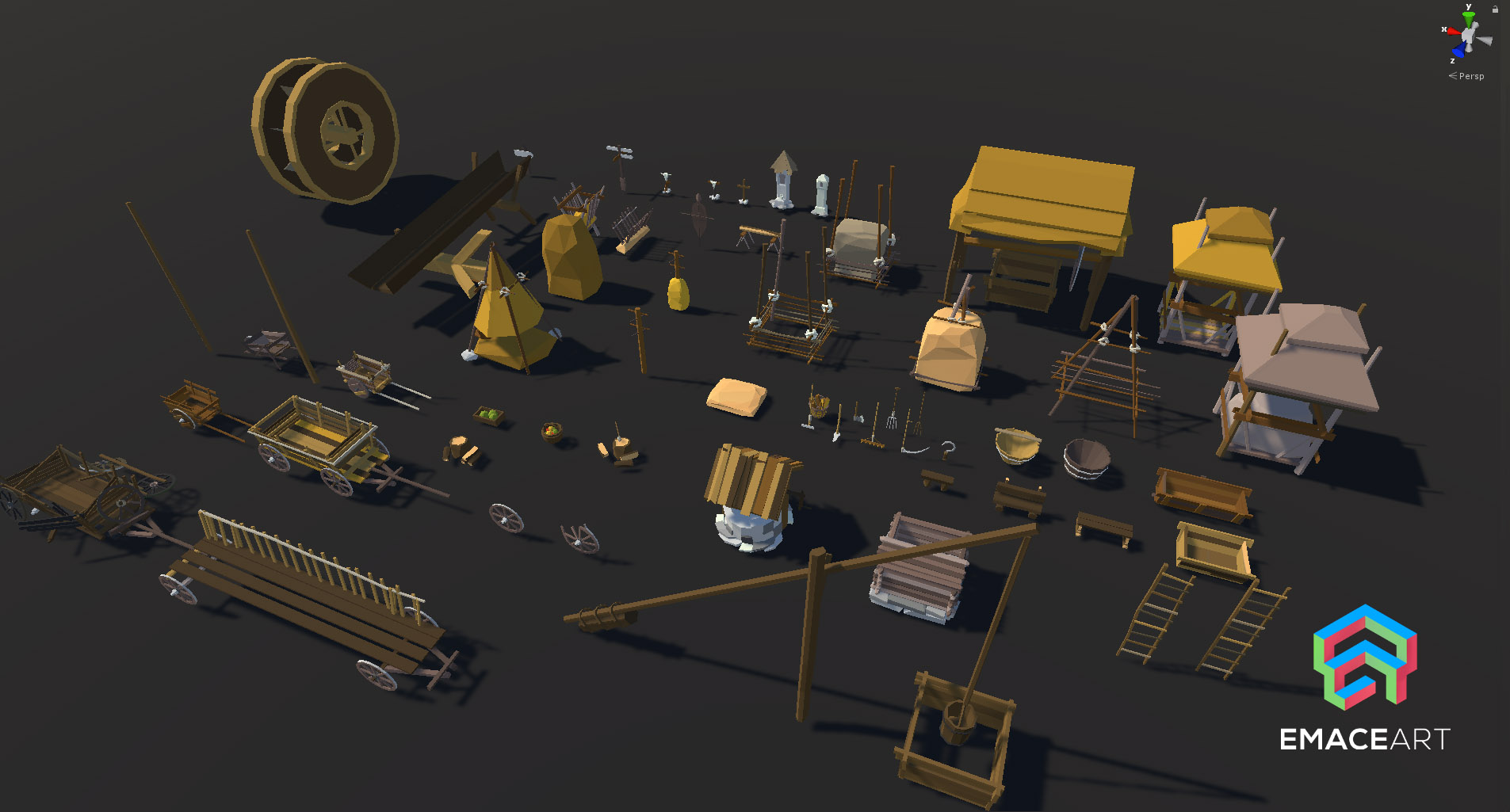 - Bushes: 13x Low-poly sprites, 9x Mid-poly, 4x Fruit bushes, 7x Dried bushes