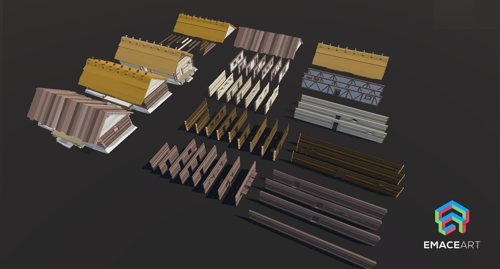 - Structural Elements: 40x Beams & Planks (Cylindrical, Dark, Angular), 10x Half-timbered walls, 5x House modules (Porch, Stairs, Veranda)