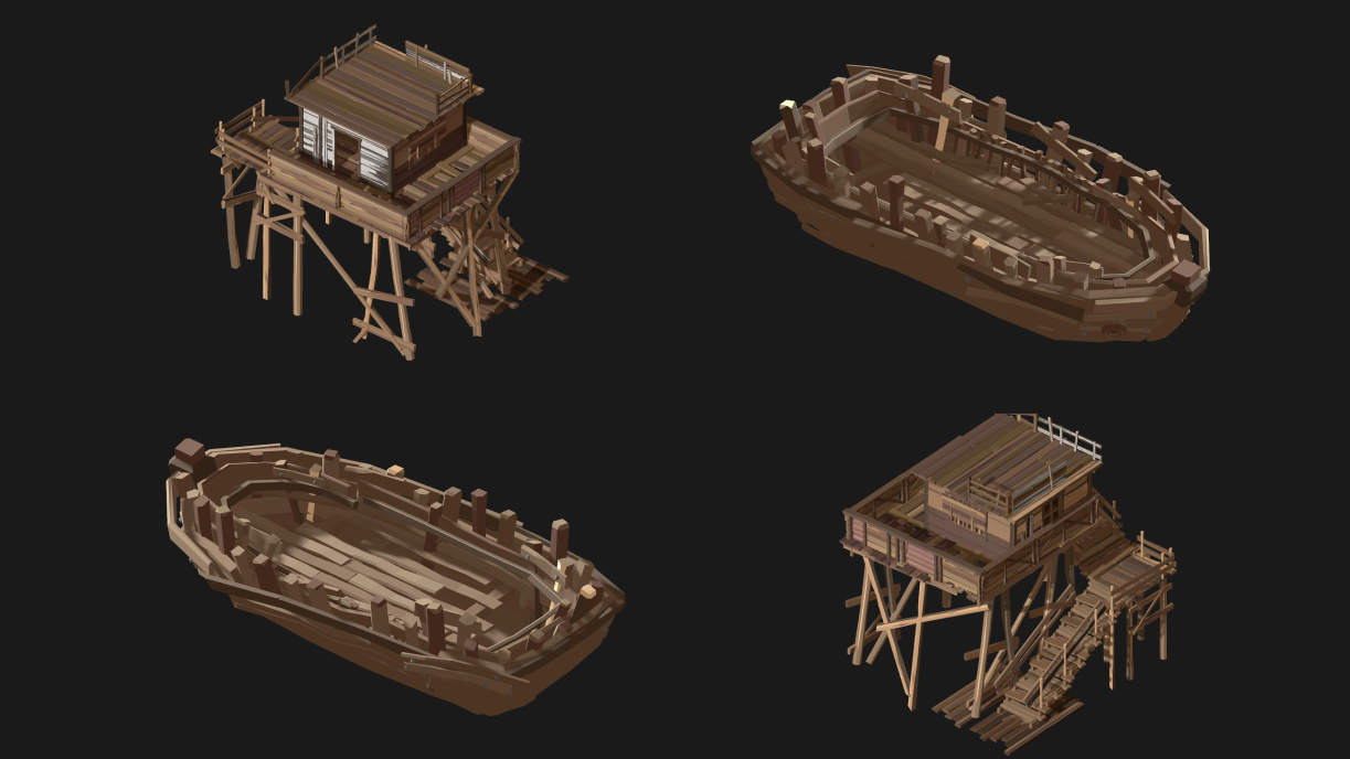 Stylized low-poly swamp-village kit for Unity. Modular walkways, stilt huts, boats and props.