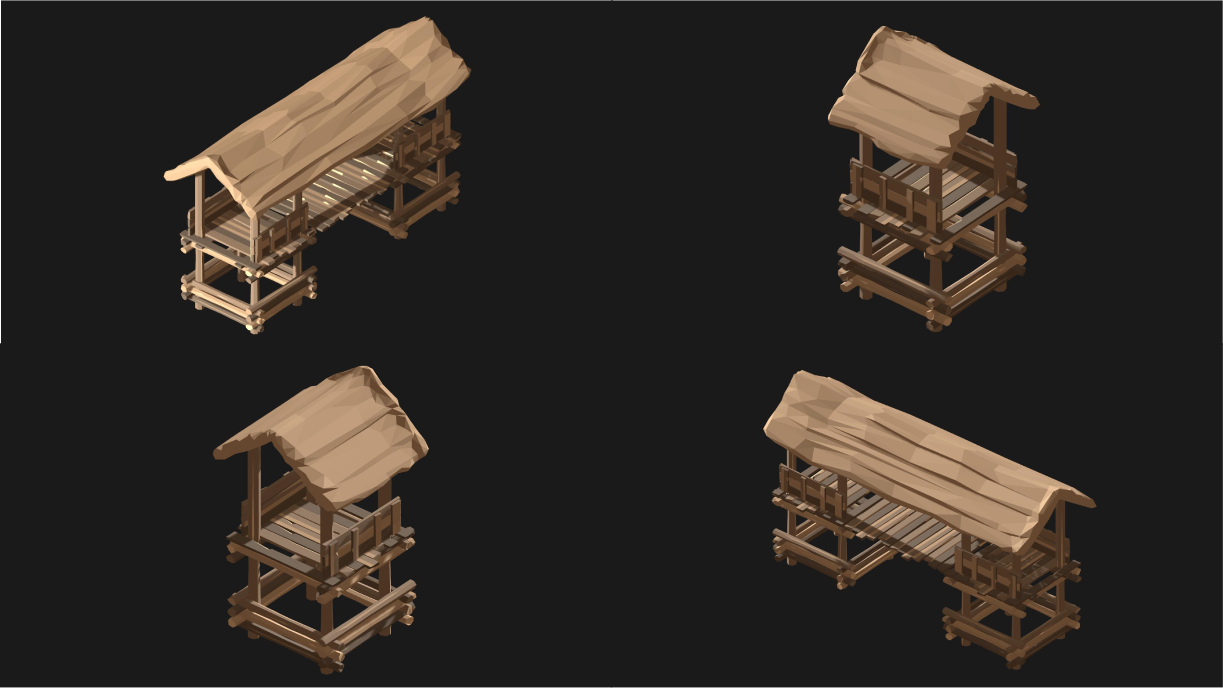 When I add a porch, the hut gains an entrance, a direction, and shade. Two of them placed side by side instantly create rhythm — the hint of a street or movement path.