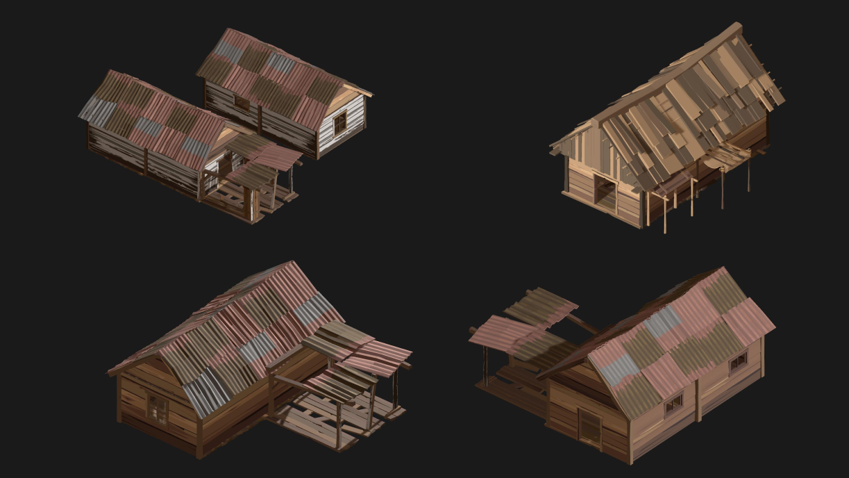 Roofs are what dominate the composition from a distance. Instead of just one style, I create a set: metal sheets, planks, patches. Three edge types — clean, broken, jagged — let me control spatial rhythm.